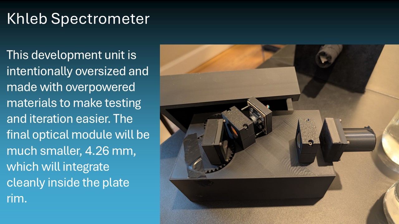 Khleb is starting this process with a three sensor system: spectroscopy, visual inspection, and weight. We believe the permutations and combinations of possible valid results meeting these parameters are very low, allowing us to determine what the user has consumed with a high degree of accuracy. The spectrometer is the key; it allows you to do what’s impossible with computer vision alone, identifying the difference between margarine and butter, the density of mashed potatoes, or the hidden sugar in a cup of coffee.