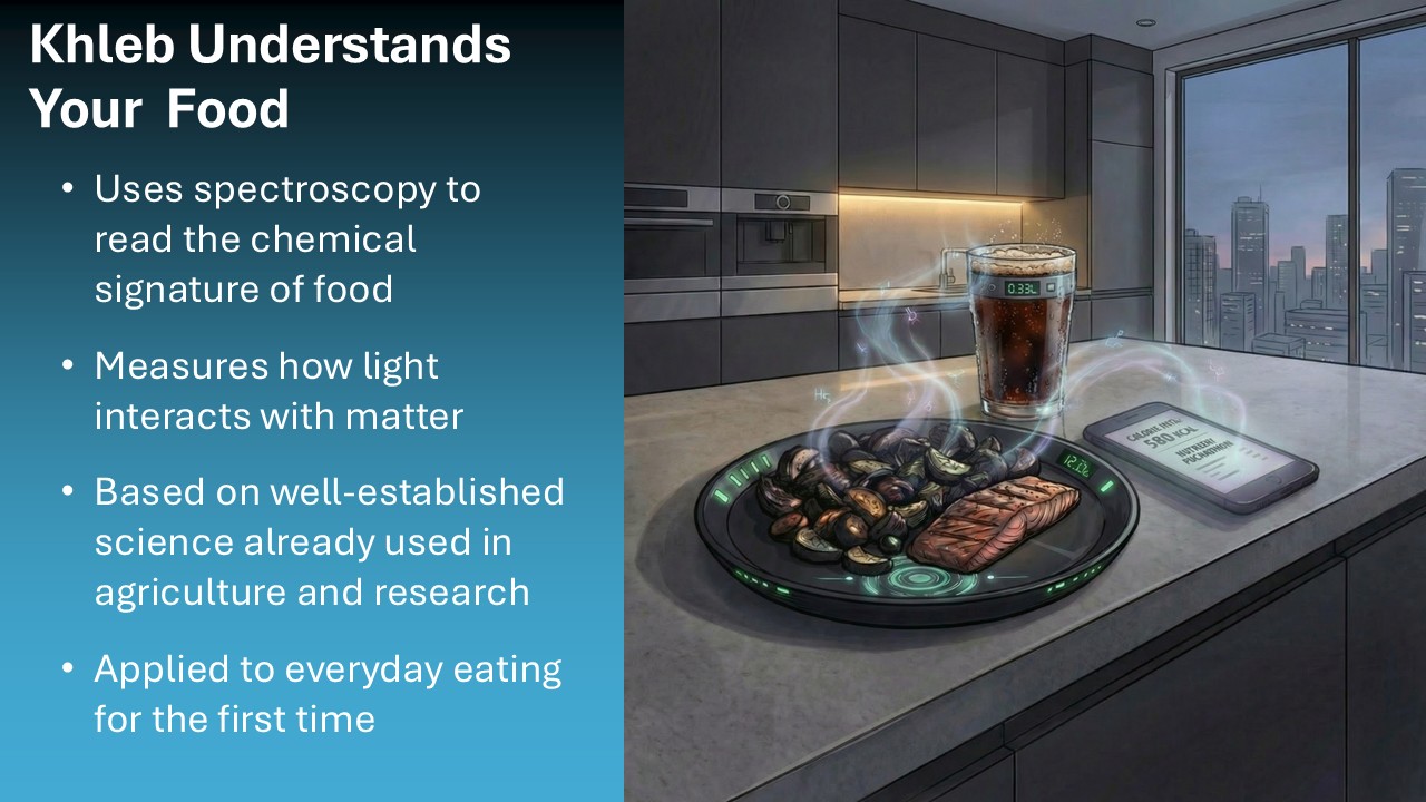 Spectroscopy, Khleb’s technical pillar for this product, is the method of detecting elements using light and is well established. Its history began over 300 years ago with Isaac Newton. A plate that just knows what you eat while you do nothing seems like science fiction (we know!) but as we see with self-driving cars and automated grocery stores, fiction is becoming a reality.