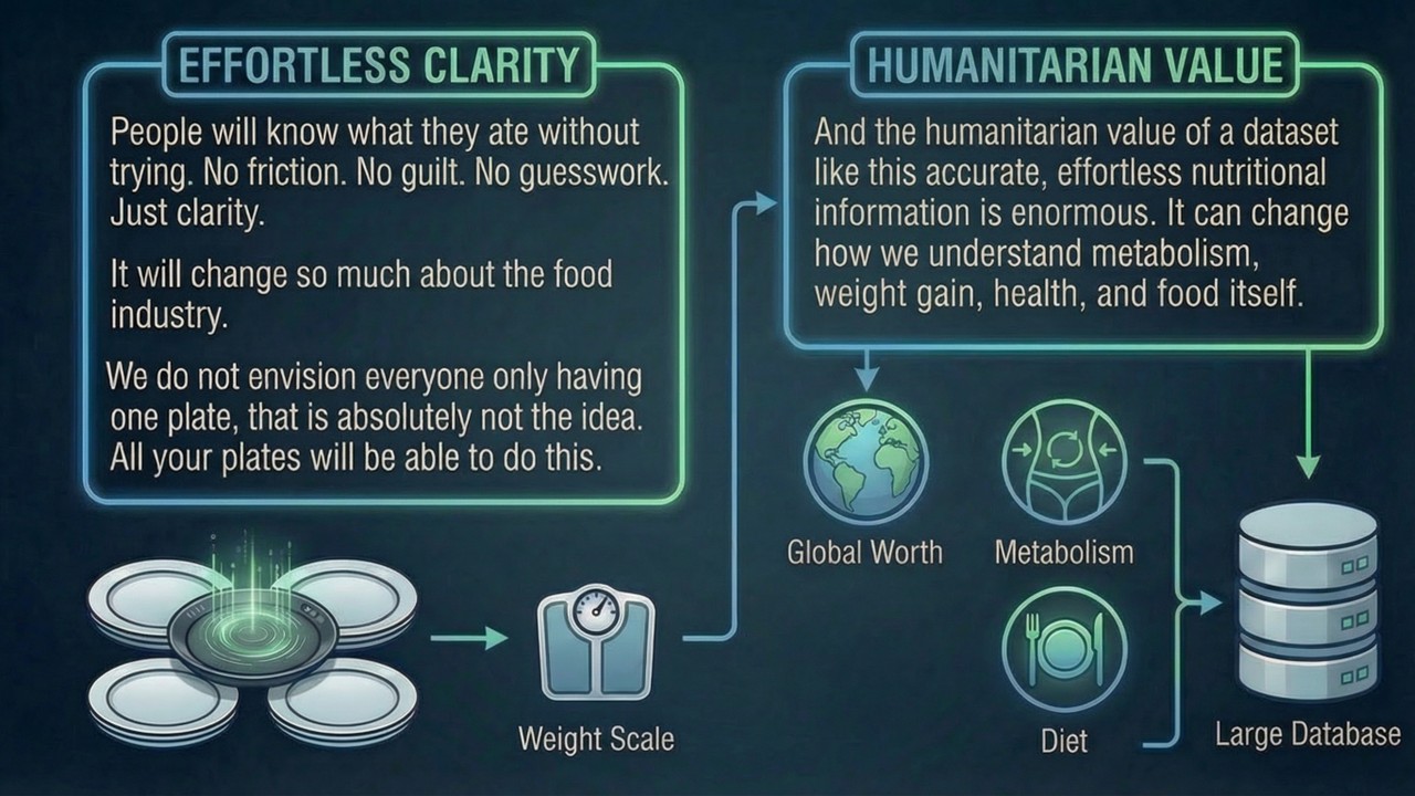 If a wand could be waved and everyone could have their nutritional data captured perfectly without lifting a finger, would anyone opt out? We are a society obsessed with longevity, weight, and image. The question isn't whether people want this data; the question is: can we design a product effortless, accurate, and affordable enough to deliver it? In our concept, this is what we are doing. You eat off a plate. That’s it. This is the only conceivable way to make this work.