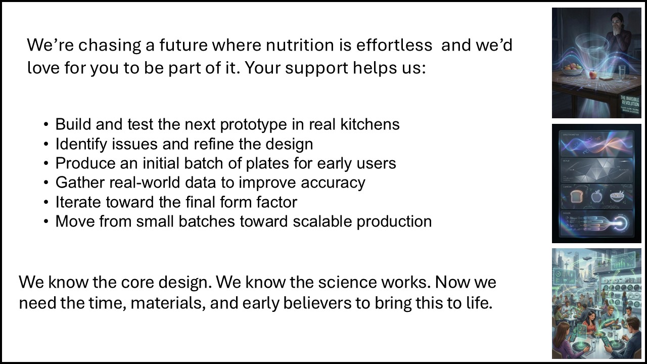 The technology required to implement this at scale and reasonable cost exists today. From a hardware perspective, this system is significantly less complex than the smartphone in your pocket; it is essentially a high-precision scale integrated with specialized cameras. By utilizing mass produced silicon sensors and integrated load cells, we are finally turning the technology used to analyze the stars toward what we eat. This same technology is already employed at scale in industrial agriculture to verify food quality; we are simply the first to bring this clinical truth to the consumer home.