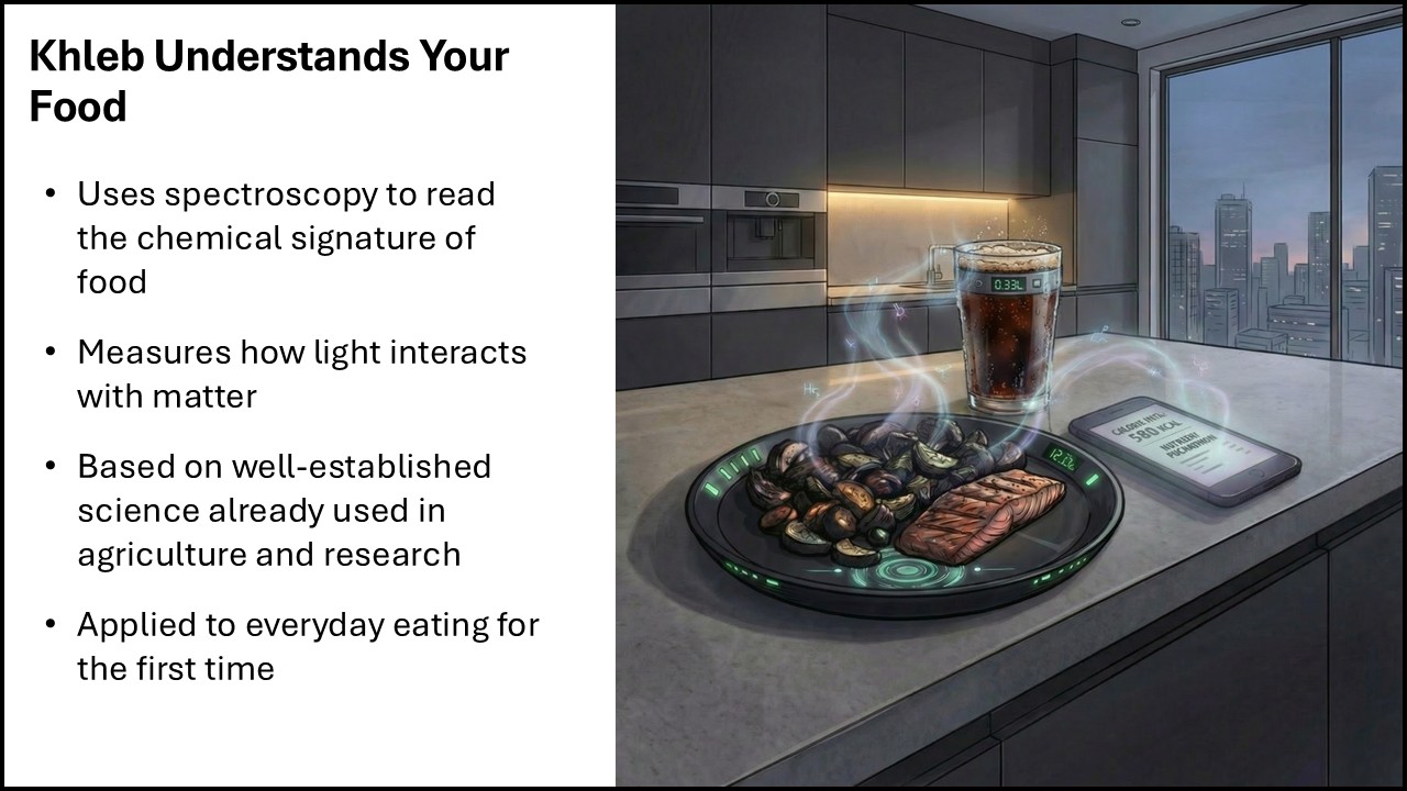 Spectroscopy, Khleb’s technical pillar for this product, is the method of detecting elements using light and is well established. Its history began over 300 years ago with Isaac Newton. A plate that just knows what you eat while you do nothing seems like science fiction (we know!) but as we see with self-driving cars and automated grocery stores, fiction is becoming a reality.