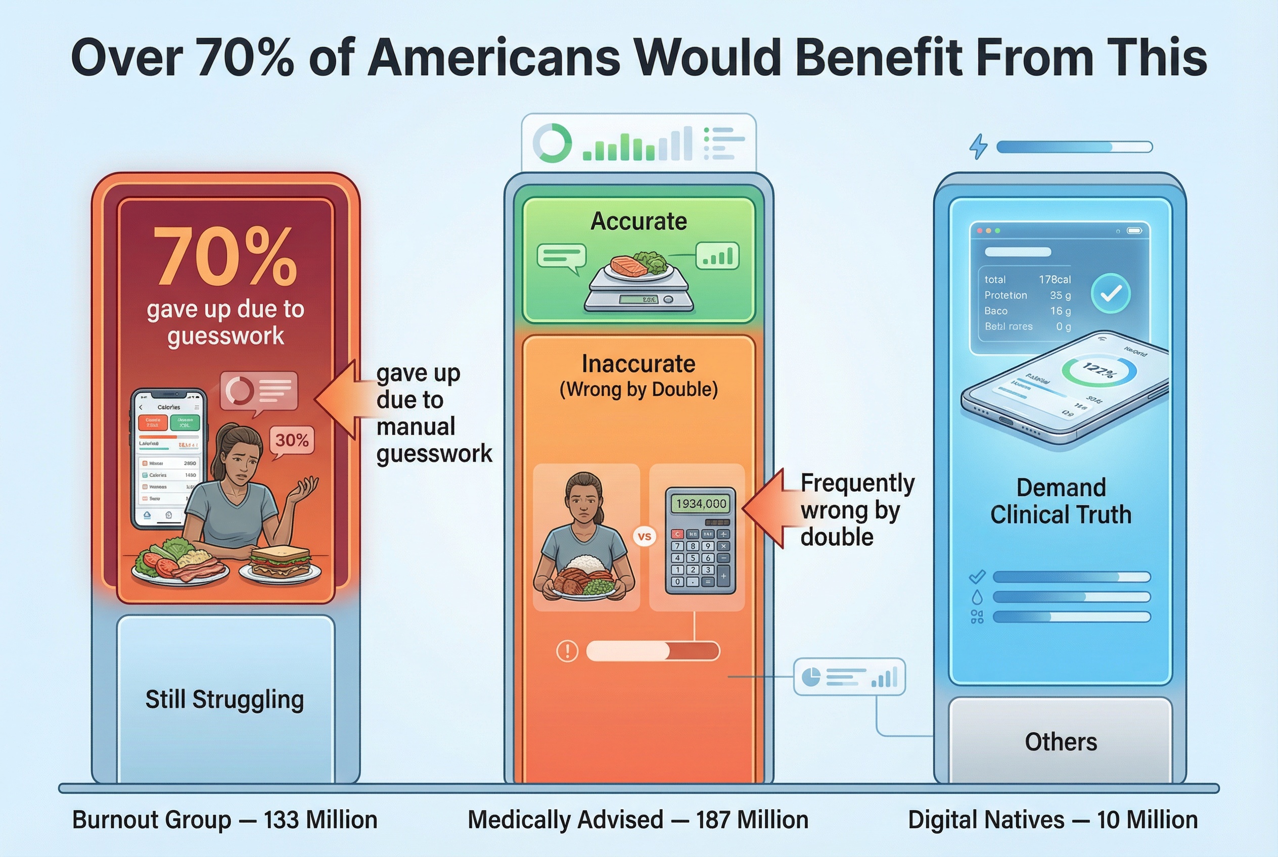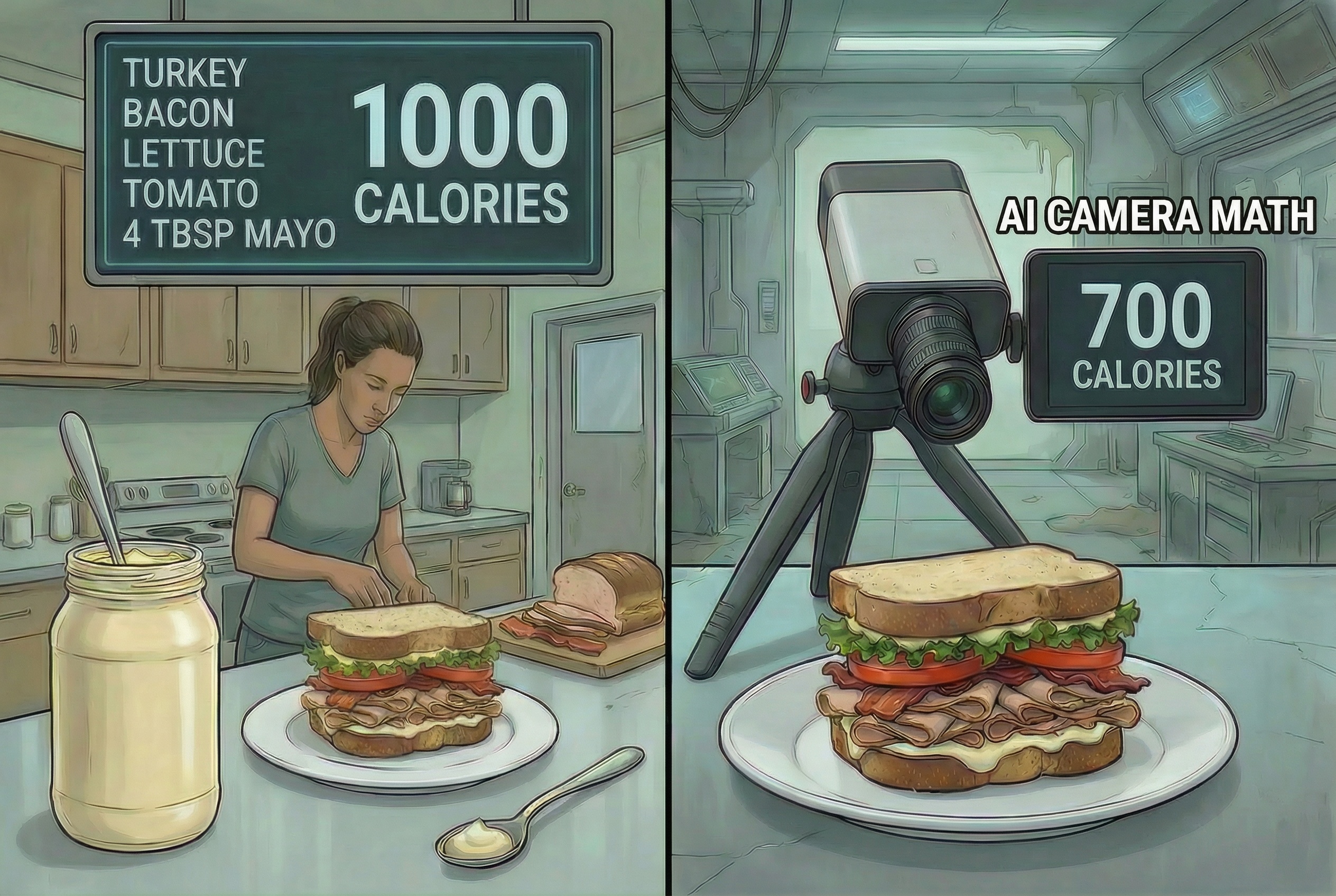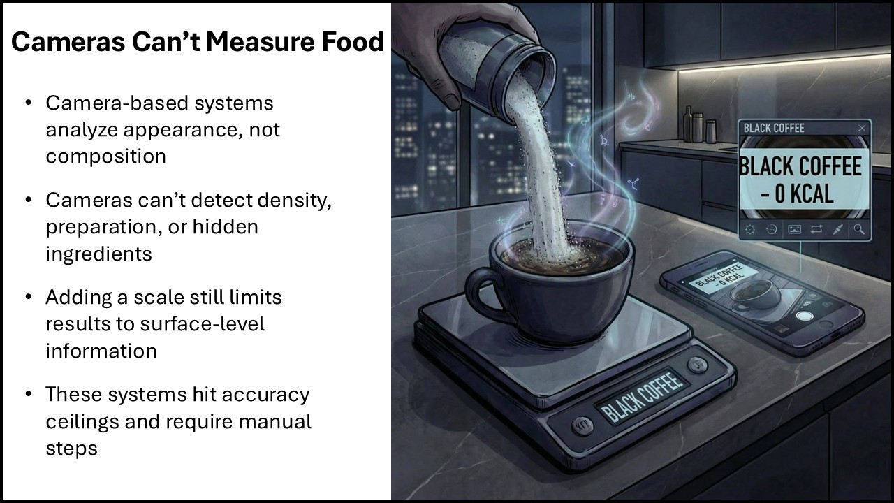 The market is flooded with "point-and-shoot" apps claiming accuracy, but these tools are fundamentally broken. Meaningful datasets are not achievable through a lens because a camera cannot see the difference between salt water, sugar water, and plain water. Even a microscope cannot see this; there is no way to "visualize" molecular identity with a 2D sensor, no matter how far one zooms in. Anyone can "witchcraft" a statistic for a headline, but the harsh reality is that it’s a visual guess frequently wrong by half or even double the actual caloric value.