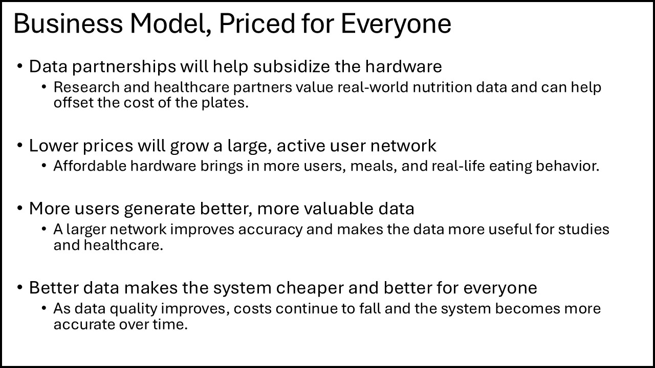 If a wand could be waved and everyone could have their nutritional data captured perfectly without lifting a finger, would anyone opt out? We are a society obsessed with longevity, weight, and image. The question isn't whether people want this data; the question is: can we design a product effortless, accurate, and affordable enough to deliver it? In our concept, this is what we are doing. You eat off a plate. That’s it. This is the only conceivable way to make this work.