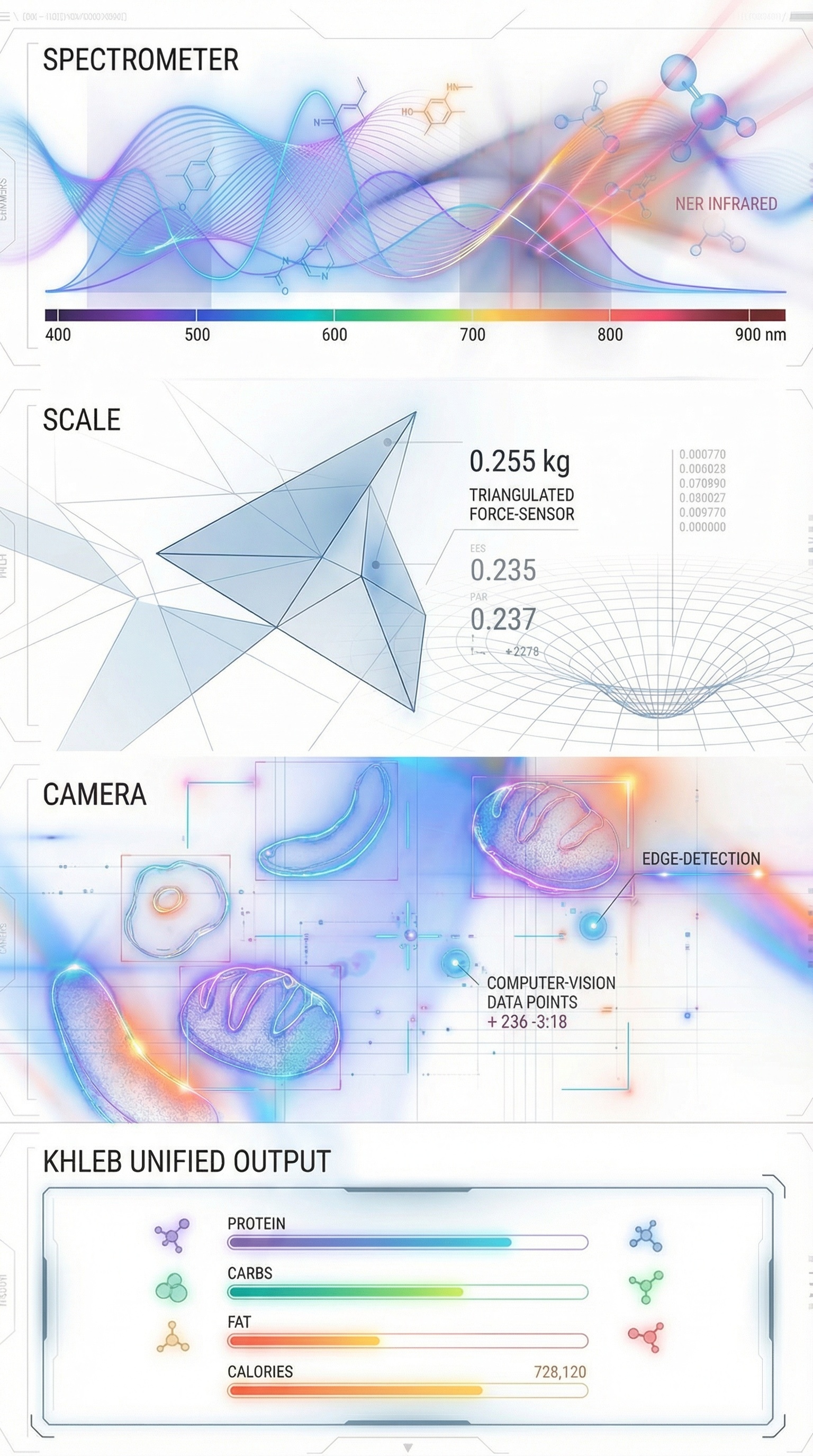 By fusing these three datapoints, we move past "guesstimation" into the realm of clinical certainty. By pairing the user via a smart utensil, or another way and monitoring the dishware state before and after a meal, Khleb replaces the friction of manual entries with automated, high-fidelity nutrition tracking.
